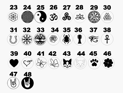 | Symbole | 1-Aleph, 2-Beith, 3-Guimel, 4-Daleth, 5-Hé, 6-Vav, 7-Zain, 8-Heith, 9-Teith, 10-Yod, 11-Kaf, 12-Lamed, 13-Mem, 14-Noun, 15-Sameck, 16-Ayin, 17-Pé, 18-Tsaddé, 19-Kof, 20-Reish, 21-Shin, 22-Tav, 23, 24, 25, 26, 27, 28, 29, 30, 31, 32, 33, 34, 35, 36, 37, 38, 39, 40, 41, 42, 43, 44, 45, 46 |